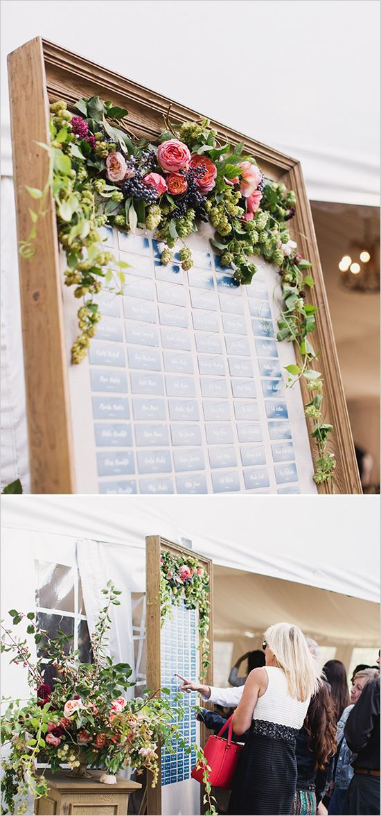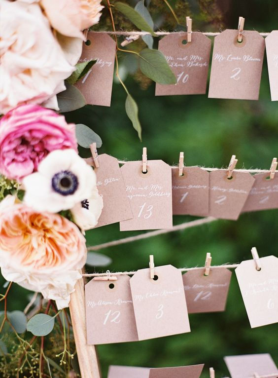 Hay muchísimas maneras de hacer un seeting creativo, con figuras relacionadas a la temática de la boda, con regalos incluidos, con pines e incluso al estilo pizarra escrita con gises. Sin embargo para estas temporadas nos encanta la idea de colocar un gran marco que señale por medio de filas de cuerda, la mesa y los nombres de los invitados escritos en pequeñas tarjetas individuales sostenidas con pinzas.
